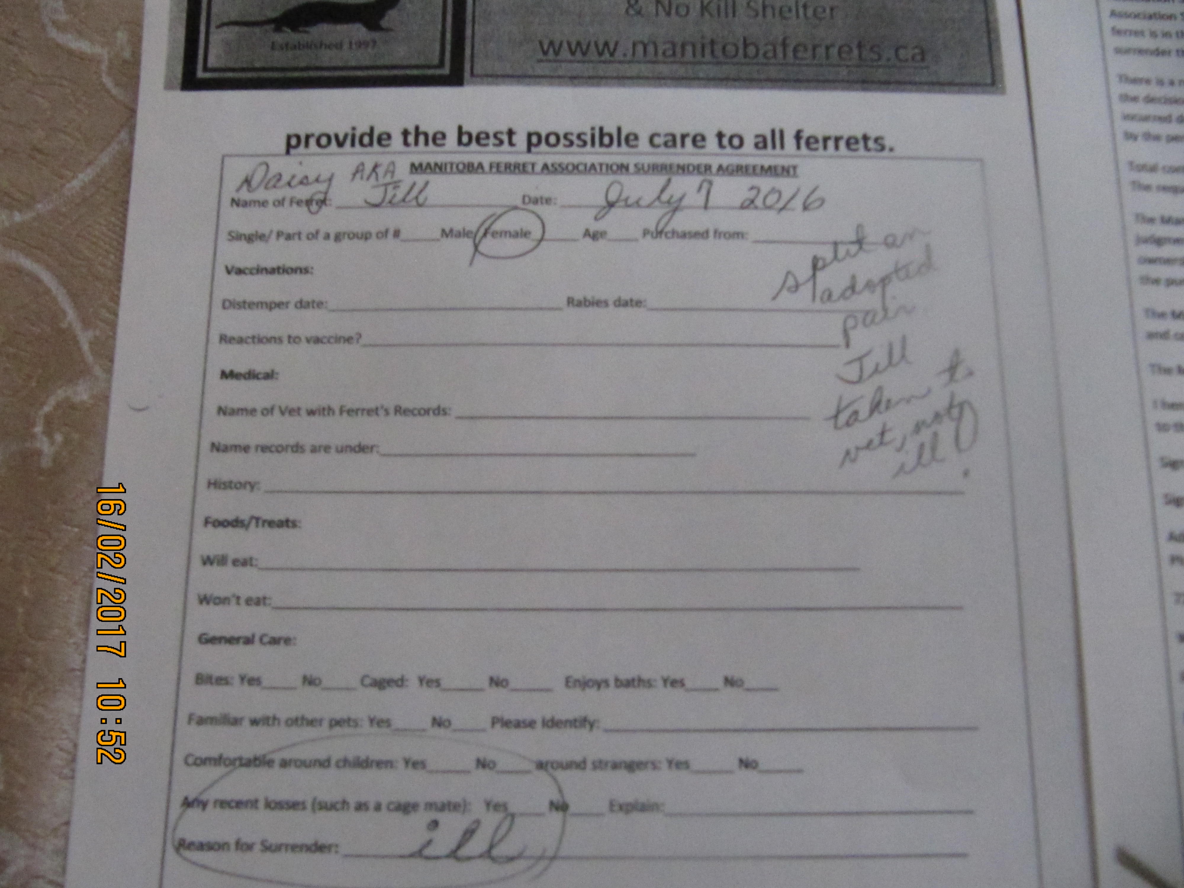 I contacted our President to advise him of the situation and to request that he accompany me when I collected the ferrets (at this point I was still hoping for both). At this point I was expecting to pick them up around 5ish. I put the vet clinic on standby that I may be bringing in a sick and dying ferret.  I didn’t want Jill to suffer and if she needed to be euthanized, I wanted to make sure they would have an appointment time for me.