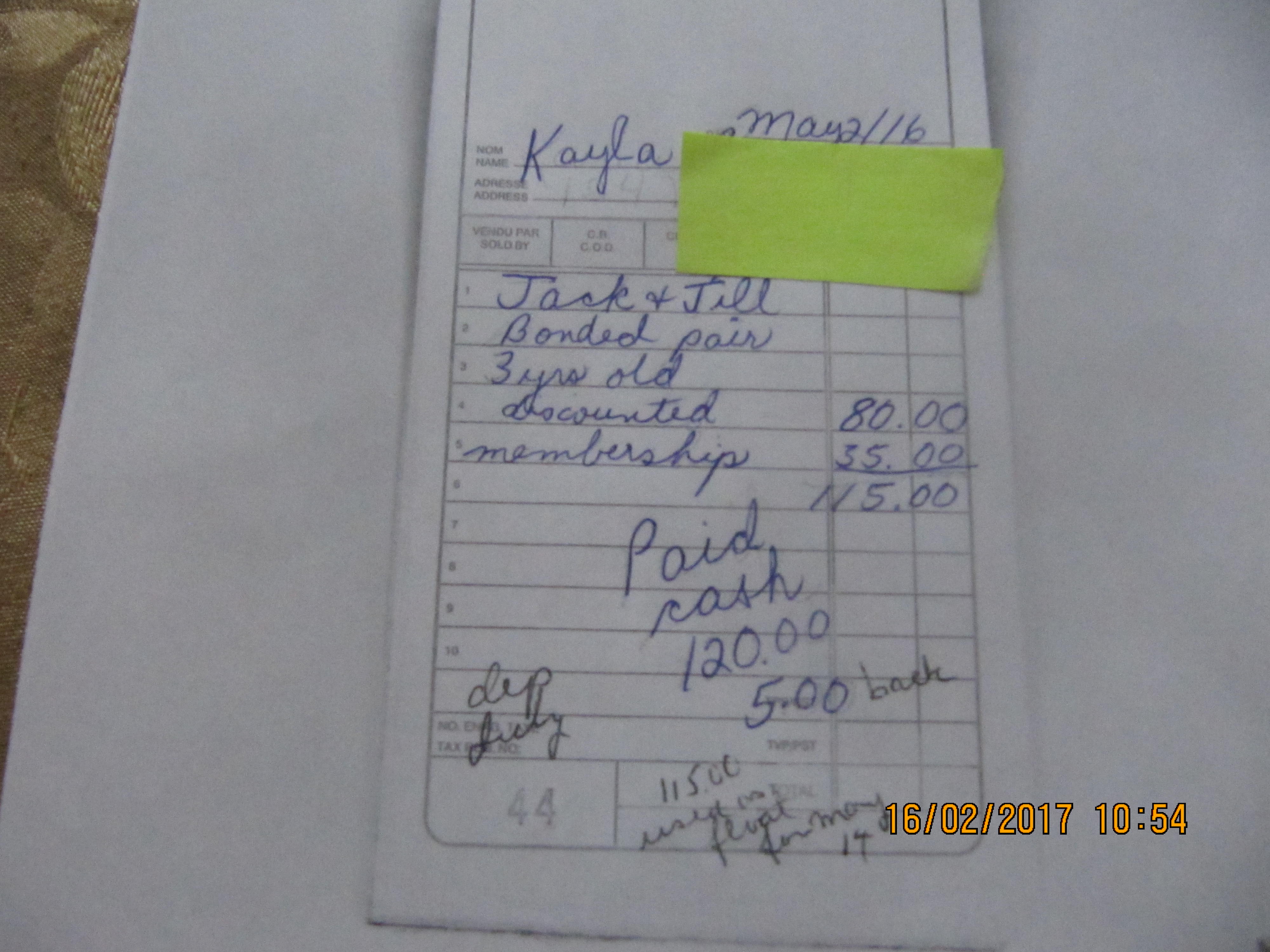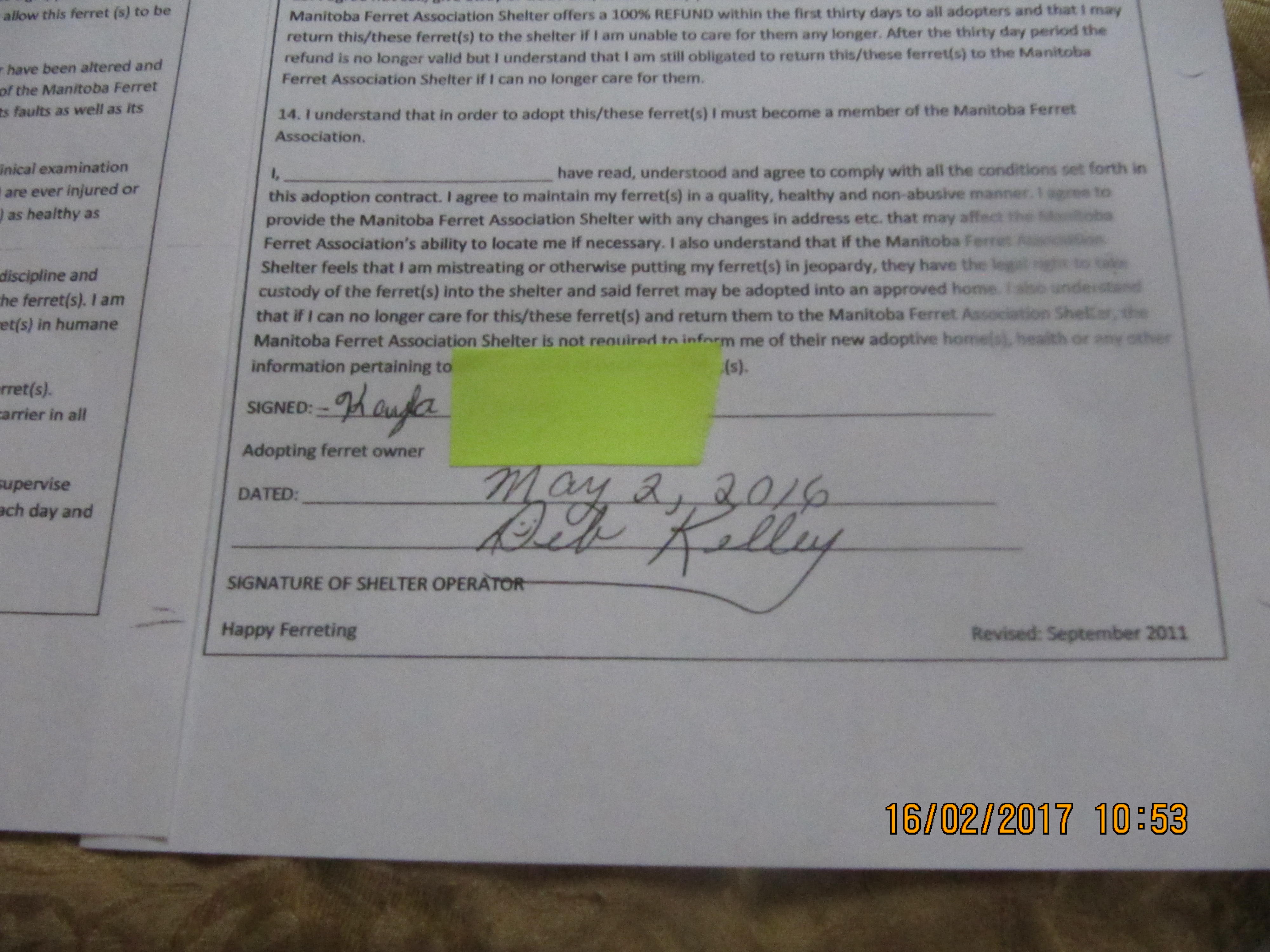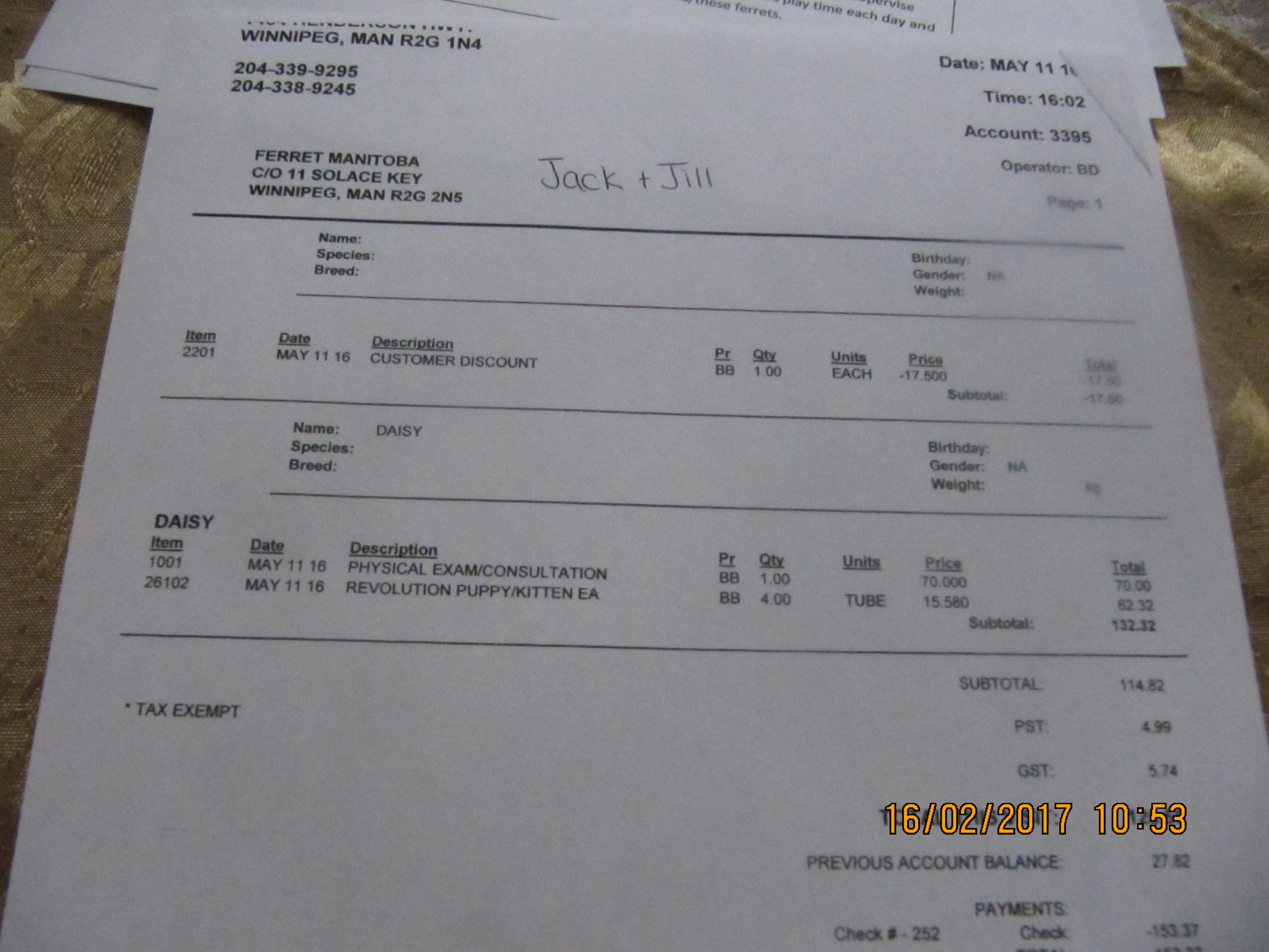 Adoption processed May 2, 2017.  Receipt issued. Jack and Jill a bonded pair discounted to the adoption fee of a single ferret – $80.00 plus membership of $35.00 for a total of $115.00.  Received $120.00, and gave her the $5.00 difference. Now most folks have donated that $5.00 to the shelter, but she wanted her change.