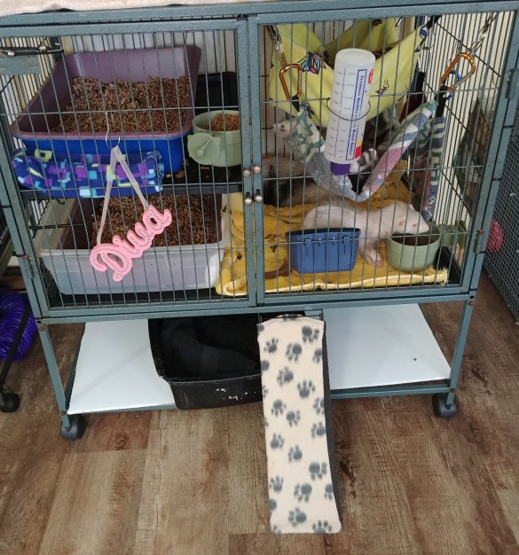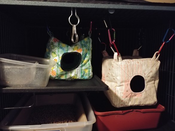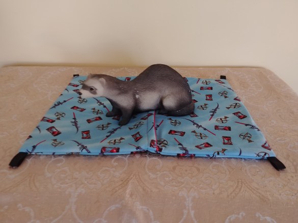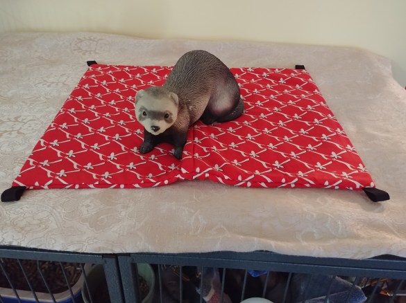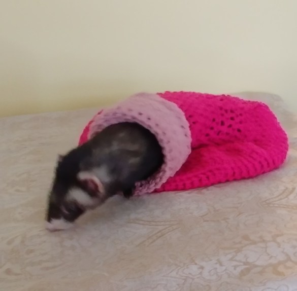 The split hammock is very versatile. Your ferret can stretch out on top or if wanting more warmth, your ferret can snuggle inside the fleece lined hammock. Hang your split hammock using carabiners purchased from your local hardware store such as Lowe’s or Home Depot. You can also use metal shower curtain hooks found at most Dollarama. Our split hammocks sell for $25.00 each. Scroll below for current stock.